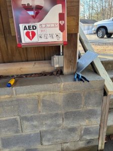 Finally, I was able to get the AED holder powered back up so that our AED will have heat in the winter and a cooling fan in the summer. Also a general purpose receptacle was added just under the AED, for whatever is needed. This was requested by a board member to allow his matches to get live updates after the matches our completed, this is a much needed addition and one further down the range is planned in the future. Please understand on the SRB/50 that their is limited power because this single circuit is shared with the 4H centers drink machine. An additional circuit is also planned in the future.